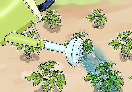 Water your plants regularly. How much you water your plants does depend on the type of plant. As with other practices, consult a Farmer's Almanac or similar publication. However, there are a few general guidelines you can follow when it comes to watering your plants. It's best to water in the morning. It tends to be cooler and less windy in the morning, giving the water the best chance to reach your plants. Water your plants at the roots. Watering at the greenery can cause damage. Younger plants may need to be watered a few times a week. Once plants are established, they may only need weekly watering. However, make sure to look into your plant's type before making a decision regarding watering.