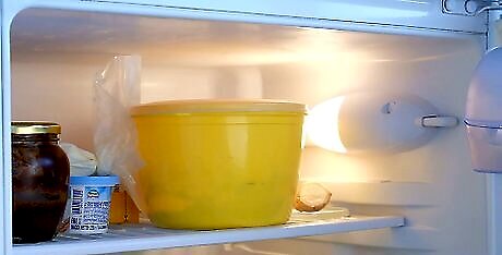 Refrigerate any dough you don’t plan on baking soon. If you aren’t going to use your starter for a few days, you can refrigerate your starter. Wait until your starter needs to be fed before refrigerating it. Then, remove all but 1/4 cup (40 grams) of your matured starter. Either use the section that you removed, or compost it. You can store sourdough in the refrigerator for up 2 weeks. If you store it longer than that, you’ll risk killing the cultures in your sourdough starter. Feed your starter at least twice a week for the most consistent results. Always feed starter the night before you plan on using it. This will ensure that it always has enough time to rise.
