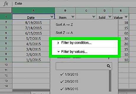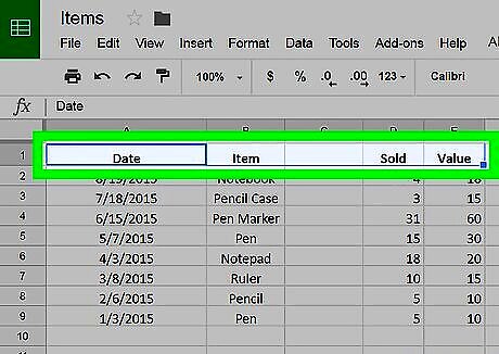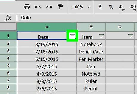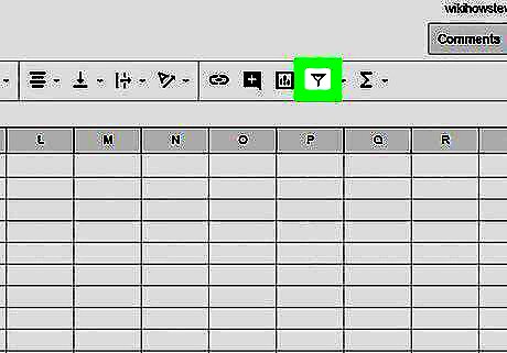 Click the Filter icon on the toolbar. This icon looks like a funnel cone next to the function icon at the top of your spreadsheet. It will bold the first cell in your selected data range.