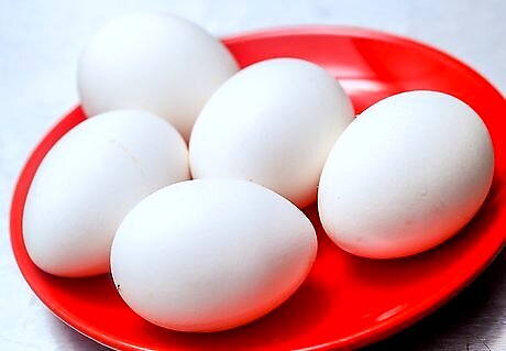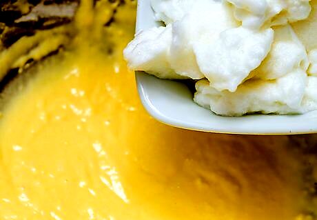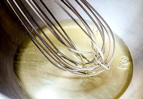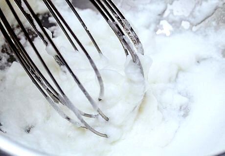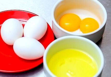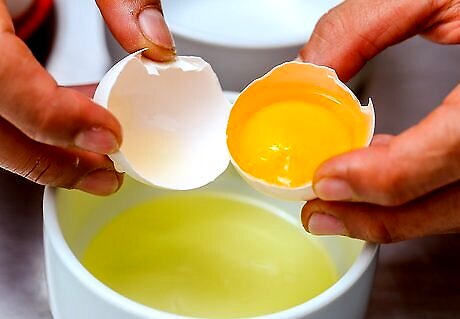 Separate the eggs. When doing this you must be careful not to get any yolk or shell pieces mixed in with the whites of the eggs. There are several ways to separate an egg: Method One: Carefully break the eggshell in half, and hold it over a bowl to allow the egg white to pour out slowly while the yolk remains in the shell. Method Two: Place the entire egg into a shallow bowl and pour off the white without breaking the yolk. It helps to hold the yolk back from the edge of a bowl with a spoon. Either method requires practice. Method Three: Hold a slotted spoon over a bowl. Crack the egg open and then pour the yolk and white through the slotted spoon. The spoon will allow the whites to go through and down into the bowl, while the yolk will remain in the spoon. Method Four: Put the egg in a bowl. Find a plastic bottle with a wider mouth. Now pinch the bottle so that it crinkles, and place it over the egg yolk. Let the pressure on the bottle release, and the yolk should be sucked up into the bottle.