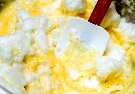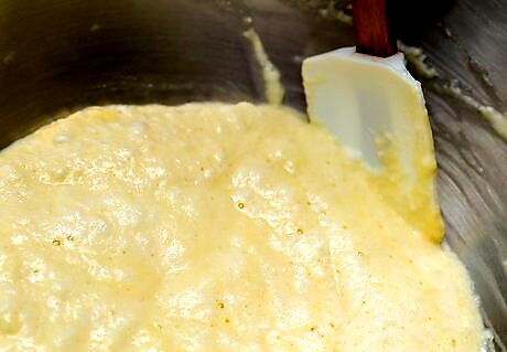 Fold the egg whites into the batter. Using a large spatula, cut a path down the middle of the mixture with the edge of the spatula. Gently turn half the mixture over onto the other half—this is called the J-fold. Continue cutting down the middle and turning a portion over. This will work even better if you use a large metal spoon or a palette knife to "cut" the egg whites into the mixture.