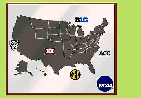 Familiarize yourself with the major Division I conferences. There are 11 conferences within the FBS and 15 in the FCS, both divided by region. It’s good to know a few of the conferences and the major teams that come from each, because each conference hosts a championship at the end of the year between its top 2 teams. The champion of each conference gets the best bowl to play in, and can even go on to the College Football playoffs. The “Power 5” conferences in the FBS are considered: The Big Ten, which consists of teams in the Midwest like Ohio State, Michigan, Wisconsin, and Iowa. The Southeastern Conference (SEC), which includes teams in the South, like Alabama, Auburn, Georgia, and Florida. The Atlantic Coast Conference (ACC), which is the home of teams along the Eastern seaboard, such as Clemson, the University of Miami, Florida State, the University of Pittsburgh, and Louisville. The PAC-12, which is made of teams along the Pacific Coast, like USC, Washington, Stanford, Oregon, Utah, and many University of California schools. The Big 12, containing teams in the mid-South and Midwest, like the University of Texas at Austin, Oklahoma, Iowa State, and Texas Christian (TCU).