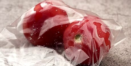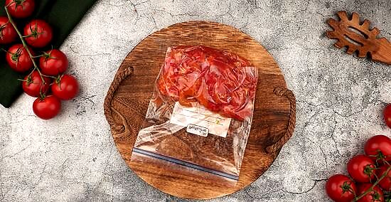 Remove the tomatoes from the freezer once they are frozen. Place them into plastic bags with seals. Make sure that all of the air is squeezed out of the bags.