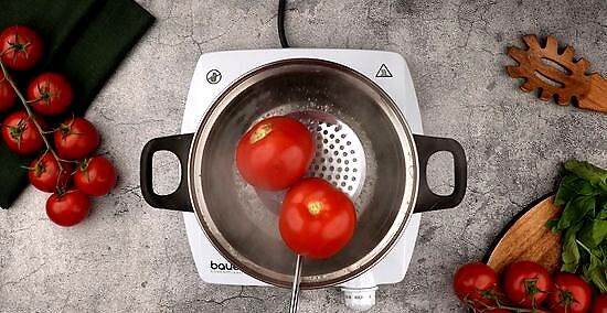 Boil a large pot of water. Put the tomatoes into the boiling water for one minute. The boiling water will loosen the tomatoes skins, thus making them easier to peel.