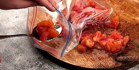 Fill zippered plastic freezer bags with the tomato pieces. Remove as much air as possible by sucking air out with a straw as you close the zipper. If you prefer, you may seal the tomatoes with a vacuum sealer. These can be purchased at kitchen supply stores.