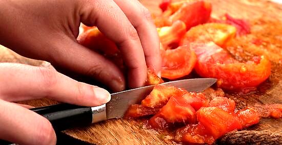 Cut the remaining tomato pieces into the desired size chunks. Smaller pieces thaw quickly and cook into sauce in less time.