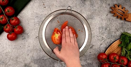 Set a colander inside another large container. Hold the tomatoes over the colander as you remove the seeds. It's not necessary to remove all of the seeds, but your tomato sauces are going to be more appealing without them. Squeeze the tomatoes slightly to remove the juice. Set the meaty portion of the tomatoes aside for now.