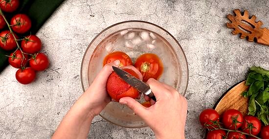 Remove the skins. Use the tip of a paring knife or tomato knife to pierce the skin on each tomato. Once there's a hole in the skin, it should slide right off. Discard the skin.