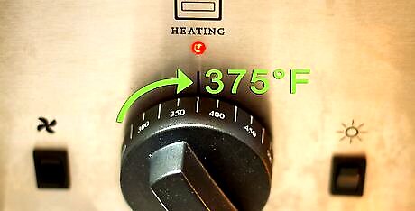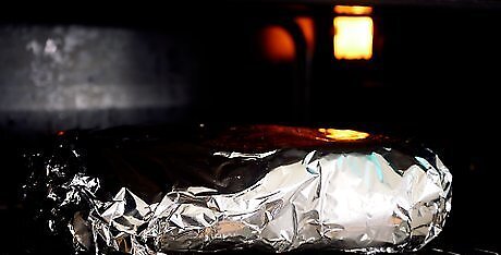 Add moisture to the loaf of bread. Either rub an ice cube or drizzle a small amount of water on the bread's crust until it gets damp. Then cover with aluminum foil.