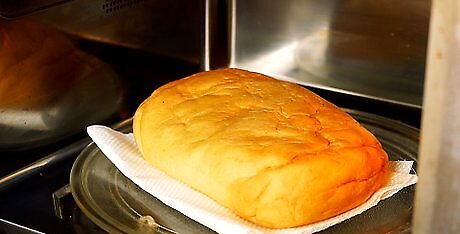 Sprinkle water on the bread's crust. Cover with a paper towel and dampen the towel with more sprinkles of water.