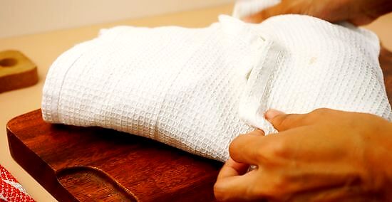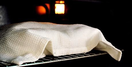 Put the wrapped loaf of bread into an oven. Heat the wrapped bread until the towel is no longer wet. Keep an eye on it, as this should only take a few minutes.