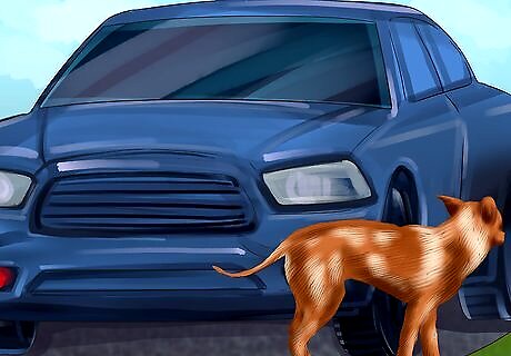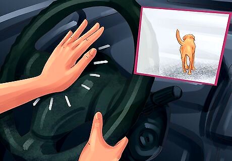Attempt to get the dog off the road. If you can’t quite get the dog to come to you, try to get the dog to run off the road in the opposite way. You might try this by honking your horn, yelling, or throwing a stick towards the dog without hitting it. Think of a way to get the dog to run to the other shoulder of the road, out of traffic. Try yelling, “Shoo!” or “Go on!” or “Get away!” to encourage the dog to run the other way.