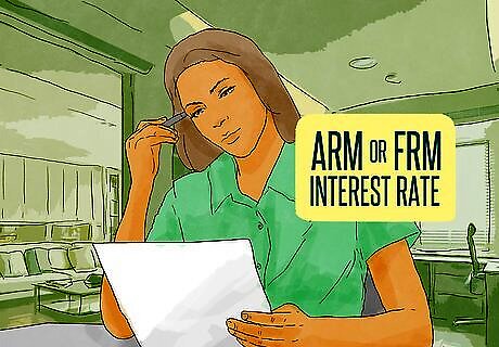 Look at the type of interest rate. The 2 basic kinds of interest rates are adjustable (ARM) and fixed rate (FRM). A fixed rate mortgage stays the same from beginning to end. An adjustable rate can fluctuate based on the market, called the index. This may cause your interest rate to go down, but the lender likely has caps on how much it can change. Knowing which is up to a variety of factors. A simple one is whether you have wiggle room in your budget for interest rate increases. If not, go with an FRM. This will help you create a budget. On the other hand, going with an ARM is a way to avoid having to refinance your mortgage in the future, which has fees associated with it. Instead, your interest rate is constantly being reappraised. If the bank seems to be trying to sell you on a FRM, however, it may be because the loan index is consistently decreasing. Ask them how interest rates on similar loans have fluctuated in the last couple years.