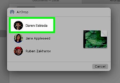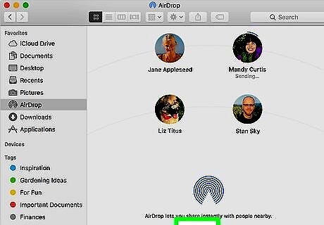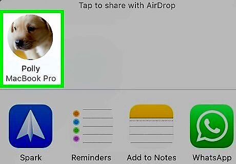 Tap the AirDrop user or icon. In the top row, you should see contacts that have AirDrop enabled. If you don't see the person you want to AirDrop your file to, tap the AirDrop icon in the second row. After you tap the icon, you'll see a list of people that aren't in your contacts as well as people who are. If the person is not in your contacts, you'll see the default AirDrop logo as well as their phone's name; if they are in your contacts, you'll see their picture as well as their name. The person who is receiving the AirDrop can either tap Accept or Decline unless you're AirDropping between your own devices (iPhone to Mac), in which case it'll happen automatically.