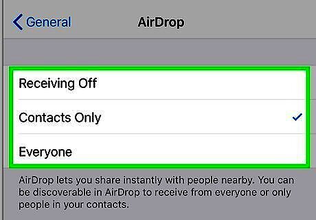 Tap an option for visibility. You can either turn off receiving so you won't get any AirDrops, allow only people in your contacts list to AirDrop, or let everyone send you files. If "Receiving Off" is selected and you can't change it, go to Settings > Screen Time > Content & Privacy Restrictions > Allowed Apps and make sure AirDrop is selected.