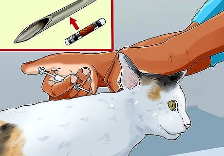 Have the chip implanted. Microchipping is a fast and near-painless process that can be done by most any vet. Set an appointment with your cat’s vet and bring them in to be microchipped as soon as your vet has open availability. The chip is implanted through a fast injection, no different in process than a routine vaccination. The cost of implantation will vary depending upon the chip brand and your vet’s fee structure, but often the procedure is around $45.
