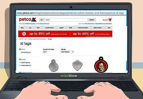 Buy online. Tags can easily be purchased and customized online through a number of websites, including online retailers like GoTags, and websites for pet stores such as Petco and Petsmart. Online orders generally cost about as much as in-store purchases, and sometimes enable a greater degree of customization. Many online retailers have a wider selection of tag colors and styles than will be available in stores. Online orders will take longer than in-store orders as most stores have same-day engraving, while online orders will need to ship.