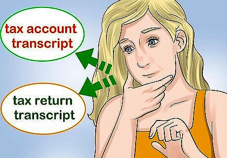 Choose which type of transcript you would like. You will see a dropdown box with 2 options for transcripts. Choose which option you need. In most cases, you should select a tax return transcript. This can be used to verify your income, apply for student aid, or get a mortgage. A tax return transcript shows your adjusted gross income as well as most forms and schedules from your tax return. A tax account transcript tells you basic information about your return, such as return type, filing status, taxable income and payment types.