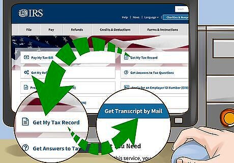 Visit the IRS website. Go to https://www.irs.gov/, and click "Get my Tax Record." Select "Get Transcript by Mail." This is a simple online form. You do not need to create an account to get your transcript by mail.