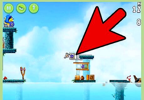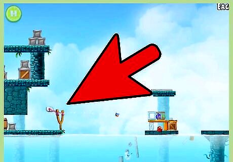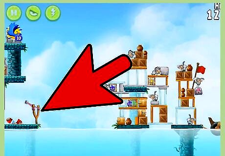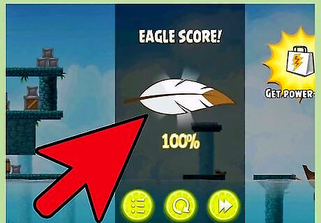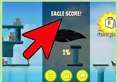 Use your slingshot to shoot the sardines. After a few seconds, the Mighty Eagle will fly down from the sky and destroy all pigs and blocks in its path. The destruction caused by the Mighty Eagle is calculated based on the damage sustained, and on where you place the can of sardines. Try aiming the can of sardines so it lands directly in front of the pig structure. The Mighty Eagle will fly down into the ground, spin out of control, and cause a higher amount of destruction.