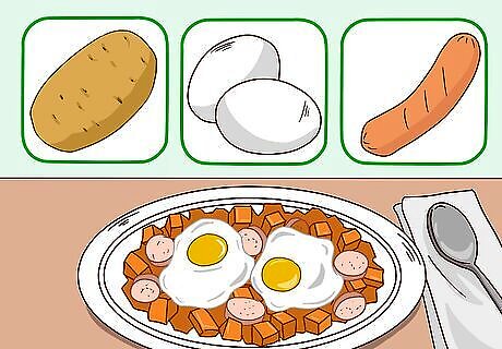 Make a sweet potato hash. Just because your diet doesn't allow potatoes doesn't mean you have to give up hash browns. Sweet potatoes are an excellent source of fiber and can be sliced or diced into a hash with eggs and ham or sausage. If you're vegan, add leafy greens, legumes, and tofu to your hash for even more fiber.