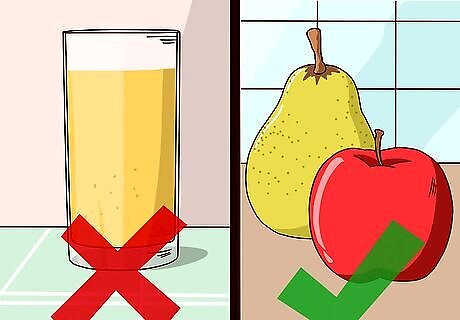 Eat more whole fruits than juice. The juice of a fruit doesn't have the fiber that the whole fruit does. You'll get more fiber at breakfast if you eat the whole fruit, including the peel if it is edible, such as on an apple or a pear. Fruit peels contain the bulk of the fiber in most fruits. You can add unpeeled slices of apple or pear to your breakfast cereal, oatmeal, or yogurt for a fiber boost.