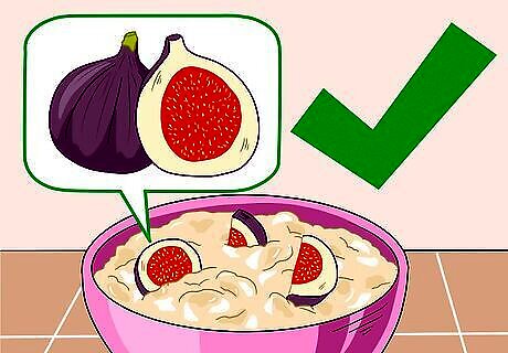 Mix figs into your oatmeal. Figs are not a significant part of many Western diets, particularly in North America. If you want to get more fiber at breakfast, consider looking towards the Mediterranean and adding figs to your breakfast cereal or oatmeal. For example, just a couple of figs sliced on your oatmeal can provide you up to 15 grams of fiber per serving, as well as giving you an antioxidant, calcium, and potassium boost.