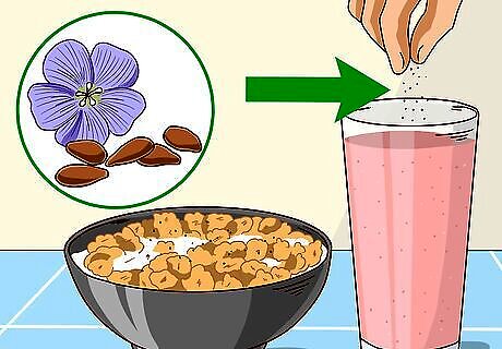 Add flaxseed to cereals and shakes. 1 ounce of flaxseed has 8 f of fiber. You can grind flaxseed in a coffee grinder or food processor so that the small seeds become like dust. Then you can sprinkle them on your favorite cereal or mix them into yogurt or smoothies to get more fiber at breakfast.