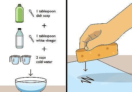 Mix a white vinegar and dish soap solution for synthetic fabrics. Mix 1 tablespoon (15 mL) of dish soap, 1 tablespoon (15 mL) of white vinegar, and 2 cups (470 mL) of cold water in a bowl and stir to combine completely. Then, use a clean sponge to dab the solution onto the stain. Blot the stain for a few seconds with more solution and a clean paper towel every 5 minutes for 30 minutes, letting it rest in between blotting. Then, pour cold water over the stain to flush the solution. Dab the fabric with a clean paper towel to dry the area. White vinegar and dish soap solution is generally effective at removing permanent marker stains on synthetic fabrics, such as upholstery fabrics and synthetic carpets.