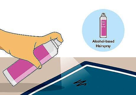 Spray on an alcohol-based hairspray for easy application. Hold the hairspray bottle a few inches away from the stain, aiming the sprayer directly on the stain. Then, spray the hairspray onto the stain until it is completely saturated. Allow the hairspray to soak in for about 3 to 5 minutes, then use a clean paper towel to dab away at the stain. Repeat this whole process as needed until the marker ink has lifted. Like rubbing alcohol, alcohol-based hairspray works to break down the chemicals in the permanent marker, making it easier to remove. Hairspray works particularly well on thicker, tougher fabrics, such as upholstery, carpets, and leather.