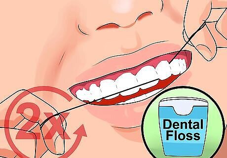 Floss your teeth twice daily. Flossing is also crucial because a toothbrush cannot reach between your teeth. You can use regular dental floss or pre-threaded flossers to get in between your teeth. When you floss, you should also make sure to: Use a long (18”) piece of floss so that you will have enough to floss between all of your teeth. Run the floss up and down the sides of your teeth. Do not just pull the floss in and out between your teeth. Use a gentle touch. Pressing too hard may cause injury or bleeding to your gums.