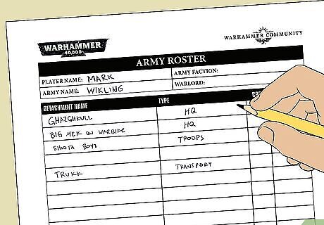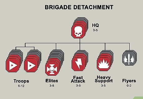Opt for a Battle-Forged army to get the maximum benefits. A Battle-Forged army is an army that is divided into pre-defined Detachments as outlined in your faction’s Codex. Each detachment fulfills a certain requirement, and your army get special bonuses for following the Battle-Forged guidance. The main requirements are minimum or maximum numbers of each Battle Role, such as HQ or Troops. Each unit's Battle Role is shown as a symbol in its description. Each detachment must be a single faction, and there are additional restrictions when choosing them.