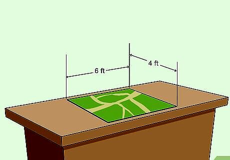 Set up the battlefield by clearing a table off or setting terrain out. You can play on any flat surface. A 6 by 4 ft (1.8 by 1.2 m) board is the most common size, but if you have small armies (500 points) you can use an area as small as 4 by 4 ft (1.2 by 1.2 m). Terrain is optional, but highly recommended, and can be placed anywhere that all players agree on. You can purchase prefabricated terrain or you can make your own homemade terrain. Warhammer rules always use inches. 12 inches = 1 foot, just in case you didn’t know. You don't even have to play on a rectangular surface, but most players prefer it.
