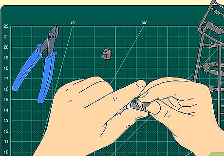 Assemble your miniatures by gluing and snapping the pieces in place. Buy the Warhammer miniatures for the units you chose from a game store or the Games Workshop website. Just pick a couple to start with, so you can get a feel for the assembly and painting process. Put the pieces together and use plastic glue to hold them together. Get your hands on: Nail or sprue clippers to remove model parts from the frame. Plastic glue for plastic models. Never use wood glue or super glue; plastic glue is ideal. Emery board, nail file, and a utility knife to clean rough edges.