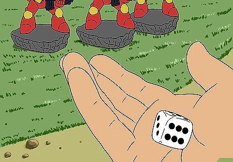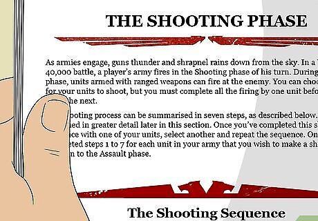 Enter the shooting phase and make any ranged attacks. Now, each of your units with ranged weapons can make an attack against any enemy the unit can “see” within its weapon's range. All models in that unit fire at the same time. Roll a die and use the unit's Ballistic Skill (BS) to see whether it was a hit. Follow the Wound Chart and instructions in the Rulebook to check for injured or killed enemies. Only one model in the unit needs to "see" the enemy. If you're not sure, put your eye down to the board and look. Banners, wings, weapons, and other "poky bits" don't count; you need to be able to see the core of the model. There are many shooting rules not covered here. It's worth reading this Rulebook section in detail.