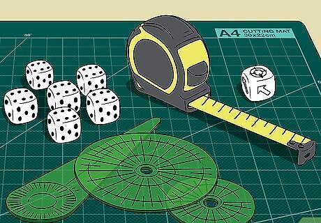 Gather your play equipment and table template. Finally, you will need a few tools to calculate distances and assess damage. If another player you’re playing with already has all of this stuff, you don't need to bring them. A lot of players prefer having their own gear, though. You need: A measuring tape that displays inches. Warhammer 40k template set (these are 3 clear plastic objects that show different blast radiuses; some unique units require special templates). A special scatter die. Artillery dice. Plenty of ordinary six-sided dice (affectionately known as a d6). Any faction-specific dice you need (some Codex need special dice with unique symbols on them).