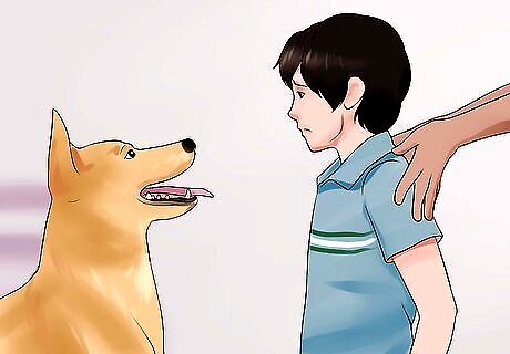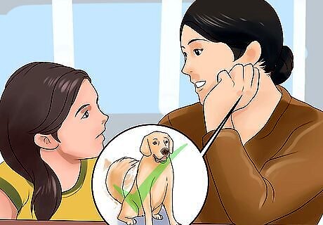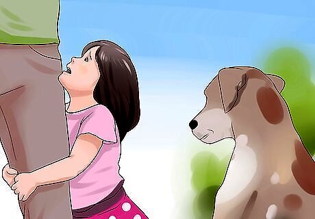 Introduce your child to an adult dog before a puppy. Children might love puppies as they're cute and cuddly, but introducing your child to an untrained puppy might not be a great idea. Puppies and children are both easily excitable and might not understand boundaries. If a child, especially one unfamiliar with dogs, interacts with a puppy he could accidentally end up bitten or scratched. If your child is already afraid of dogs, this could reinforce that fear. Find an older, trained, and calm adult dog for your child's first interactions. If you're considering adopting a dog, finding an older dog at a shelter is not only a great option to reduce fear in your child. It's good for the dog as well. Older animals are often not adopted and end up in shelters for months and even years, and might be euthanized if they're not housed at a no-kill shelter.