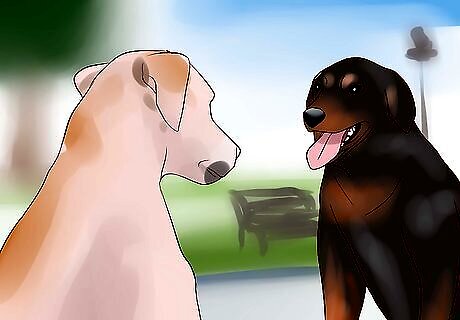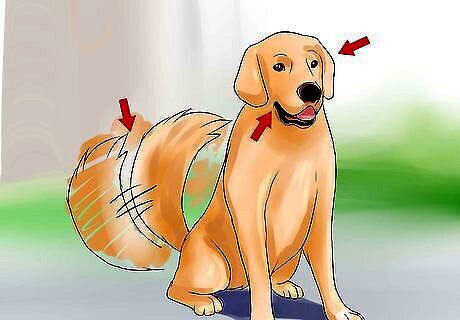 Learn to read a dog's body language. Many times, people fear dogs because they do not understand how they communicate. Dogs are fairly straightforward in terms of behavior. Learning to read when a dog is being friendly is a great way to alleviate an unnecessarily fearful reaction when you encounter a dog. A happy dog will appear relaxed and will hang his tail and head in a natural position. He may gently wag his tail from side to side or in a circular motion. His mouth will either be closed or slightly open and he might be panting at an even tempo. The corner of his mouth might even be turned up as if he's smiling. If you notice a dog behaving like this, he's probably safe to approach and touch. An excited dog is often mistaken for an angry dog, and dogs may get excited when you encounter them in public or enter someone's home. However, there are important differences. An excited dog will center his weight on his rear legs and might bounce around. His tail and head are held upright, and he may wag his tail. His mouth is generally open and some barking might occur. If a dog is being aggressive, however, he will be showing his teeth and wrinkling his nose rather than just opening his mouth and his weight will be centered equally on all fours. His tail will be held straight up or, if scared, will be between his legs. An aggressive dog will likely not break eye contact. Dogs are rarely unprovoked, so you are not likely to encounter an aggressive dog very often. An alert dog is often also mistaken for an aggressive one. When alert, dogs might bark or growl but this is unlikely a sign of aggression. An alert dog will have his ears pointed forward and be staring at whatever's interesting him. The hair on his back might be standing up and his mouth is typically closed. You probably do not have to be afraid of an alert dog. However, you should not attempt to pet or interact with a dog when they're engaged with something else. They might become startled and nip.