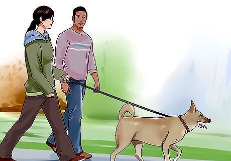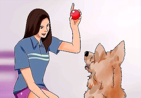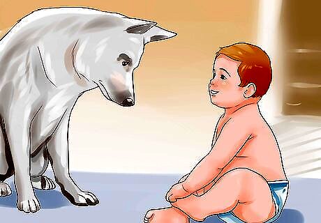 Introduce a dog to a new baby. If you have a dog and are bringing home a new baby, you need to follow certain protocol to make sure the introduction goes smoothly. Dogs usually adjust well to babies, but you should still guide introductions with careful planning. Before your baby arrives, teach your dog general obedience skills. Sit, lie down, stay, and leave it are commands your dog should know. This way, if he's getting overly excited around the baby you could easily intervene and get him to calm down and take a break. If possible, allow your dog to interact with friend's babies in the months leading up to delivery. Introduce him to new signs and sounds so the strange noises the baby makes do not frighten him. Make sure your dog's first encounter with the baby is pleasant. Allow everyone else present to enter the house before the baby comes so your dog can greet them as usual. When you show your dog the baby, stay calm as this will help your dog stay calm. Praise your dog for being calm around the baby and speak to him in a pleasant voice as he interacts with the new family member. Give your dog attention when the baby is present. People are often tempted to do the opposite, giving the dog extra attention to make up for any he lacks when the baby is around. However, this can lead your dog to believe good things only happen when the baby is gone. If he gets treats, praise, and attention in the presence of the baby he'll learn to like the new family member. Always reward your dog for calm, polite behavior around the baby. If he gets too excited or playful, have a cue word that will make him give the infant space. Something like "Go lie down" or "Shoo" should signal to your dog he needs to take a few minutes to calm himself.