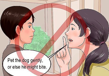 Choose your words carefully. Oftentimes, when trying to explain proper behavior, parents end up fueling a fear of dogs. Be careful how you speak to your child when she interacts with a new dog. People often say things like, "Pet the dog gently, or else he might bite" or "Do not pet a strange dog, as he might be aggressive." Such phrasing is well-intentioned, but what you're really telling your child is that dogs are something to be feared. Instead of those kinds of phrases, try to reword warnings in a positive light. Instead of saying, "Don't pet a dog like that," try something like, "Dogs really prefer to be petted on their backs gently. It makes them happy." Instead of warning children that strange dogs might bite, instead say, "Dogs like to get to know people before being petted."