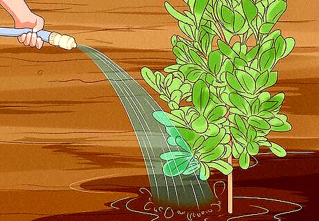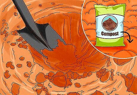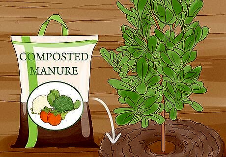Dig a hole sufficiently deep for taking the tree's roots. Blend ten pounds of composted manure into the soil.