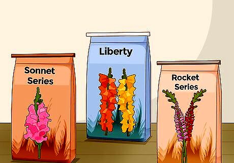 Buy snapdragon seeds. Snapdragons grow as thick, one to three-foot tall spikes adorned with colorful flowers. Different varieties produce flowers in different colors, so choose the one that works best with your flower garden's color scheme. Here are a few good choices: Rocket series: this produces three-foot tall plants with flowers in red, pink, yellow, purple and white. Sonnet series: One and a half-foot tall plants in red, yellow, pink, purple and white. Liberty series: Two-foot tall plants in red, yellow, pink, purple, white, and several more variations.