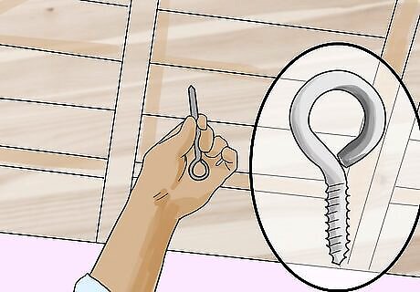 Drill screw-eyes into unfinished porch ceilings. The screw-eye is a metal loop. After installing two screw eyes, you’ll loop the rope or chain attached to the arms of the swing into it. Drive your screw-eye into a thick beam or joist at the place you wish to locate your porch swing. Locate a thick beam or joist (at least two inches wide and five inches thick) that can support a screw-eye. Once you’ve located the joist or beam where you wish to install your porch swing, drill a pilot hole into it with a drill at the point from which you wish to hang the porch swing. This is an important step that can prevent your beam from splintering. Turn the eye-screw into the hole as far as it will go, then pass a screwdriver through the circle of the eye-screw so that its central point is just below the hole into which you drove it. Place one hand on the handle of the screwdriver and place one hand on the other end of the screwdriver. Push up hard with the screwdriver against the eye-screw to jam it tightly into its hole. Install another screw-eye in another joist or beam at a distance from the first that is roughly equivalent to the length of the porch swing. Use screw-eyes with a four-inch shaft and a socket with a diameter that can accommodate the rope or chain you’ve selected to hang your porch swing.