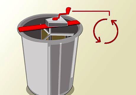 Spin the frames. Crank the machine by hand or switch it on and let the motor do the work. As the extractor spins the frames, the honey will be forced to the walls of the drum. From there, it will gradually ooze down to the bottom.