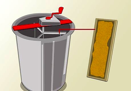 Place the frame into an extractor. There are both electric and hand-cranked models available. Regardless of the type you use, you need to place the frame or frames of honeycomb directly into the barrel of the machine. Snap or clip the frames in place. The exact method you need to follow when securing the frames in your machine will vary from model to model. Make sure that you have instructions for the model you use or otherwise understand how it should work.