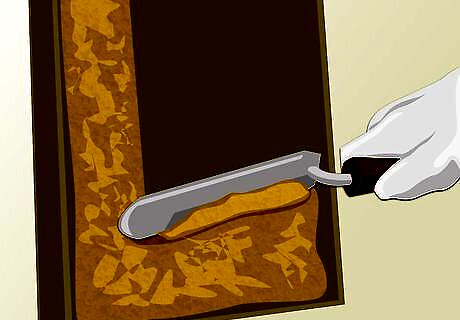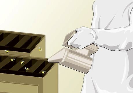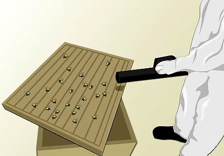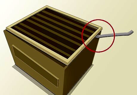 Open the hive. Use a hive tool to lift the inner cover off the top of the hive. This tool looks like a small crowbar. Slip it under the cover and push down on the tool to lift the cover up. Bees seal the edges of their hive with a resin material known as "propolis." The seal is pretty strong, so you will be unable to lift the inner cover off without the use of a specialized tool.