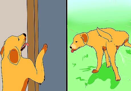 Give your dog bathroom breaks when needed. Taking your dog outside to go to the bathroom in inclement weather is not fun, but it’s necessary to have a fun day indoors with your dog. Once you’ve had your dog for a while, you’ll learn to identify the signs your dog gives you that it needs to go outside. If you’re not sure how to tell when your dog needs to go, look for the following signals: Turning in circles while sniffing the floor is one signal. Circling in dogs is a natural indication that they are going to poop and sniffing may indicate they are looking for an area to go to the bathroom. Standing, scratching, or barking at the door is another indication your dog needs to use the bathroom. Housebroken dogs will usually do one of these things when they need to go out. If your dog is whining while doing the things above, it is usually a good indication it needs to go to the bathroom. Whining by itself can mean any number or things, but when it is combined with sniffing, circling, and standing, scratching, or barking at the door, you can safely assume your dog needs to go outside.