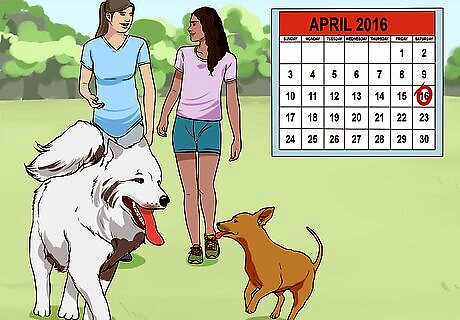 Schedule doggy play dates. If you have friends with dogs, set up play dates with them for when you have to be indoors. Your dog will enjoy getting to play with another dog and you can enjoy hanging out with your friend. You can also take your dog to doggy day care, where it will have the chance to socialize and play with a number of other dogs.