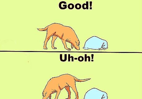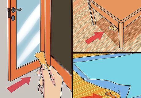 Hide treats around the house. Setting up ways for your dog to scavenge is also a fun indoor activity. To do so, hide some treats all over the house. You can hide them behind doors and underneath tables and rugs. Encourage your dog to sniff them out. You can also vary this game by hiding a treat under an opaque box or container. Set up three or four of these containers and place a treat or toy under only one. Encourage your dog to sniff each container. When your dog stops at the one with the prize, lift it up and enthusiastically praise your dog for finding the right one, then allow your dog to eat the treat or play with the toy as a reward.
