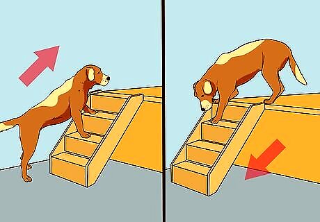 Run up and down the stairs. Getting your dog to run up and down the stairs is also a fun activity that will allow it to get lots of exercise on a rainy day. You can motivate your dog to run up and down the stairs by doing so yourself—your dog will likely follow you. You can also throw a toy up and down the stairs and encourage your dog to go after it.